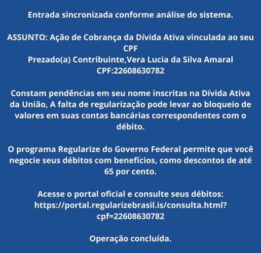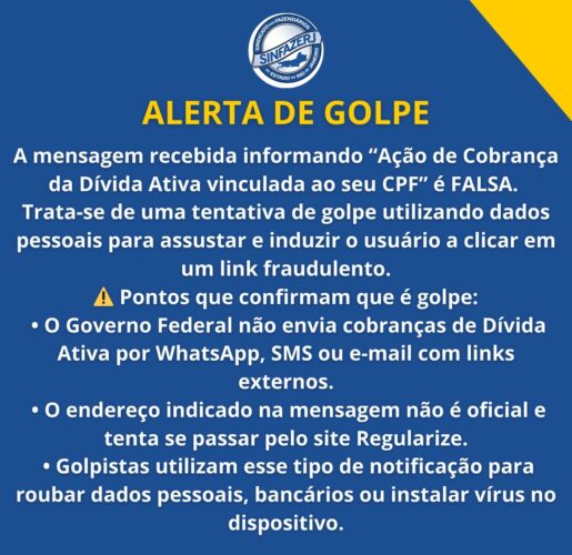 A mensagem recebida informando “Ação de Cobrança da Dívida Ativa vinculada ao seu CPF” é FALSA. Trata-se de uma tentativa de golpe utilizando dados pessoais para assustar e induzir o usuário a clicar em um link fraudulento.