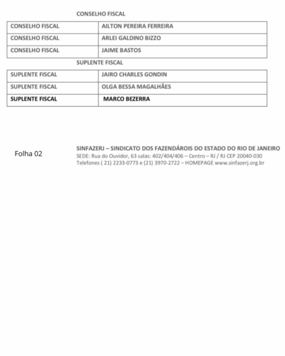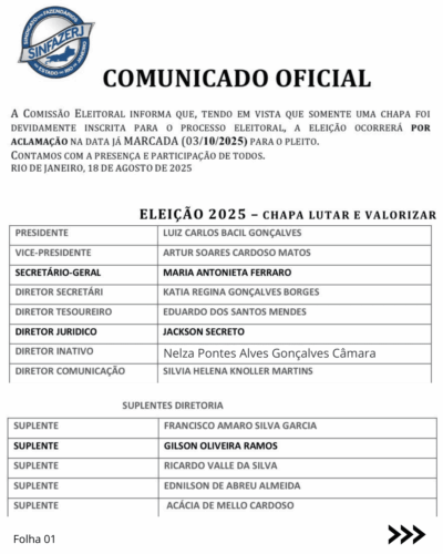 CHAPA VENCEDORA NAS ELEIÇÕES SINFAZERJ – 2025. SALIENTAMOS QUE FOI ÚNICA CHAPA QUE SE APRESENTOU E FOI HABILITADA PELA COMISSÃO ELEITORAL.
