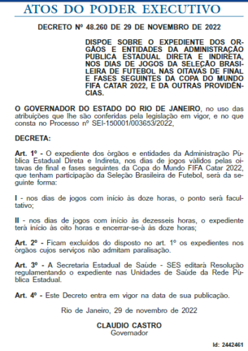 Decreto – horário de expediente em dias de jogo do Brasil nas oitavas de final