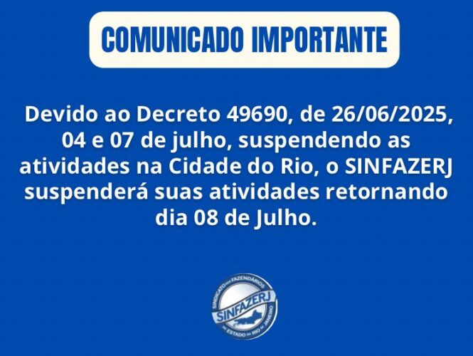 DEVIDO AO DECRETO 49690 O SINFAZERJ SUSPENDERÁ SUAS ATIVIDADES NOS DIAS 04 E 07 DE JULHO, RETORNANDO NO DIA 08 DE JULHO