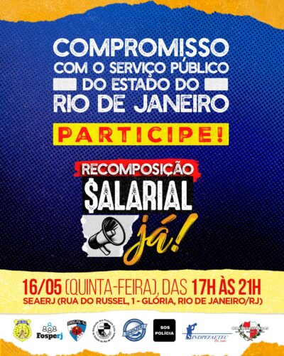 No próximo dia 16 de maio (quinta-feira), o Movimento Recomposição Salarial, Já! convida os servidores de todas as categorias do funcionalismo estadual a participarem de um encontro com o tema “Compromisso com o serviço público do estado do Rio de Janeiro”.