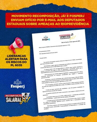 Nesta sexta-feira (22), o Movimento Recomposição Salarial, Já! e FOSPERJ enviaram, por e-mail, um ofício a todos os deputados estaduais manifestando grande preocupação com o Projeto de Lei nº 6035, que ameaça a sustentabilidade do Rioprevidência.
