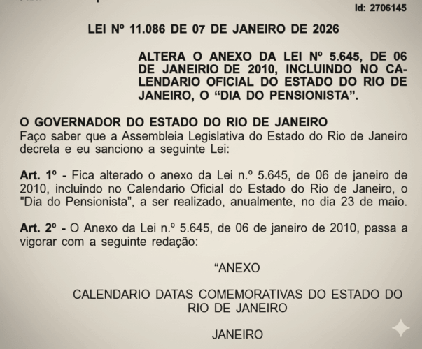 O Dia do Pensionista entra oficialmente no calendário do Estado do Rio de Janeiro, celebrado em 23 de maio.