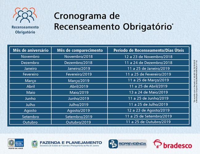 A atualização cadastral será realizada nos dias úteis de 11 a 25 de cada mês. Somente poderão fazer o recenseamento no próximo mês todos os nascidos em novembro. Quem nasceu em dezembro deverá aguardar o referido mês para procurar a agência do Bradesco e assim por diante. Os nascidos de janeiro a outubro vão fazer o recenseamento somente em 2019, dentro dos seus respectivos meses de nascimento. A atualização cadastral obrigatória será destinada aos servidores do Poder Executivo e abrangerá os órgãos que fazem parte da folha de pagamento administrada pela Secretaria de Fazenda, por meio do Sistema Integrado de Gestão de Recursos Humanos (SIGRH-RJ).